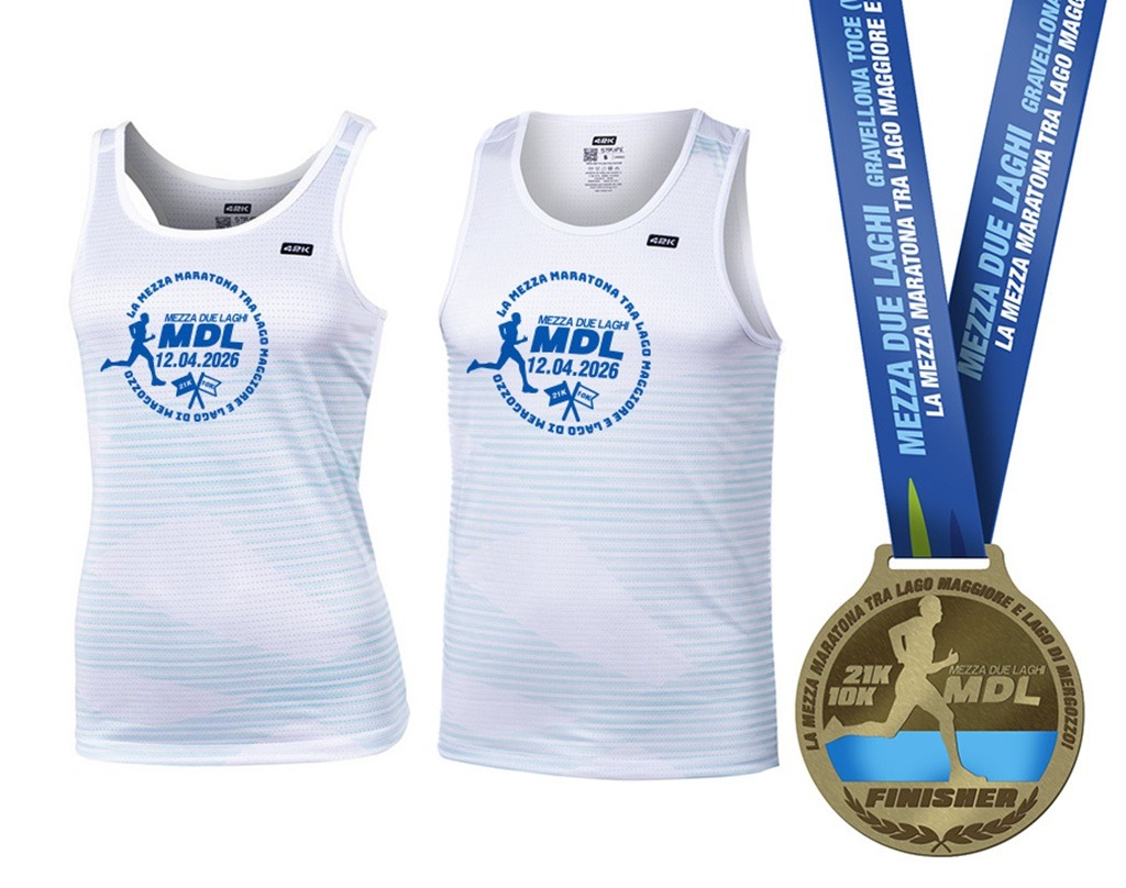 La Mezza Due LaghiT-SHIRT E MEDAGLIA – Gli organizzatori hanno scelto T-shirt tecnica dell’edizione 2026, sulla quale è rappresentato un runner in piena performance tra i laghi Maggiore e Mergozzo stilizzati. Bianca, con scritta in color azzurro intenso proprio per associare la luce del paesaggio percorso allo scenario dei due Laghi e riporta sul fronte anche nome e data della manifestazione. La medaglia finisher è un tradizionale medaglione dorato sul quale è raffigurata l’immagine di un runner che ha sullo sfondo i color azzurro dei laghi.