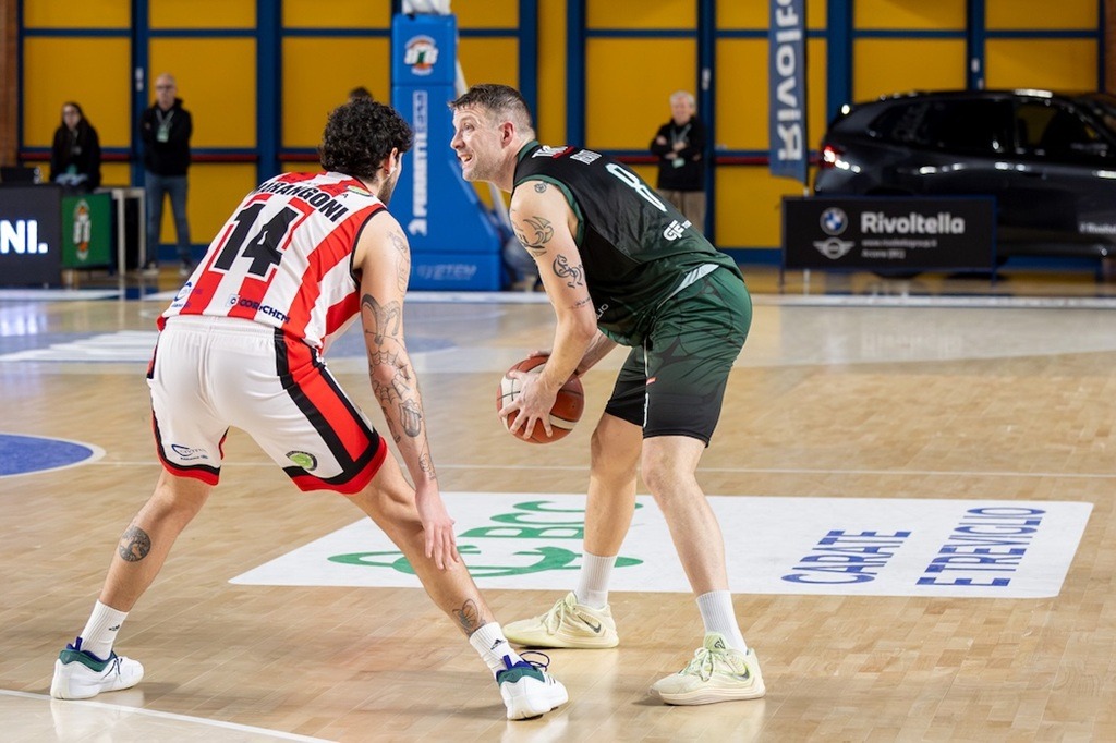 In avvio coach Villa presenta Rubbini, Restelli, Reati, Taflaj e Marciuš, mentre i cinque di partenza per Ghirelli sono Gasparin, Da Campo, Marangoni, Carr, Udras. I due capitani aprono la contesa: Gasparin da due, Reati da tre e da subito il vantaggio è biancoverde. Con 5 punti (tripla e viaggio in lunetta) in una dozzina di secondi, Taflaj apre la partita: 10-2 (2′). Da Campo recupera parzialmente (14-11), ma Marciuš promuove un nuovo allungo. Anche la panchina dà il suo apporto: Morina e Galassi firmano il +9 (22-13). La prima sirena suona sul 22-15.